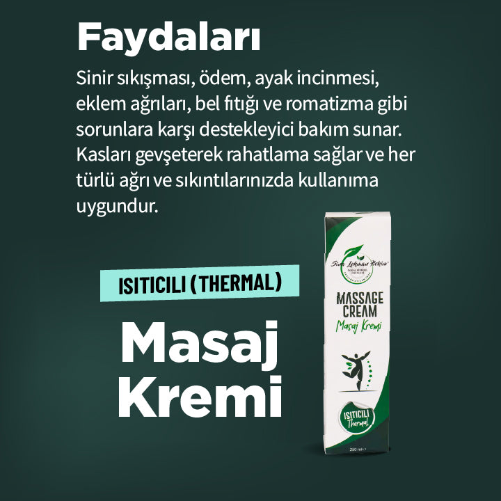 Sina Lokman Hekim’in özel formülüyle geliştirilen bu masaj kremi, yakı bandı etkisiyle vücudu lokal olarak ısıtarak rahatlama sağlar. Isıtıcı etkisi sayesinde uygulandığı bölgede kan dolaşımını destekleyerek kas gevşemesi ve ağrı hafifletici bir etki sunar.